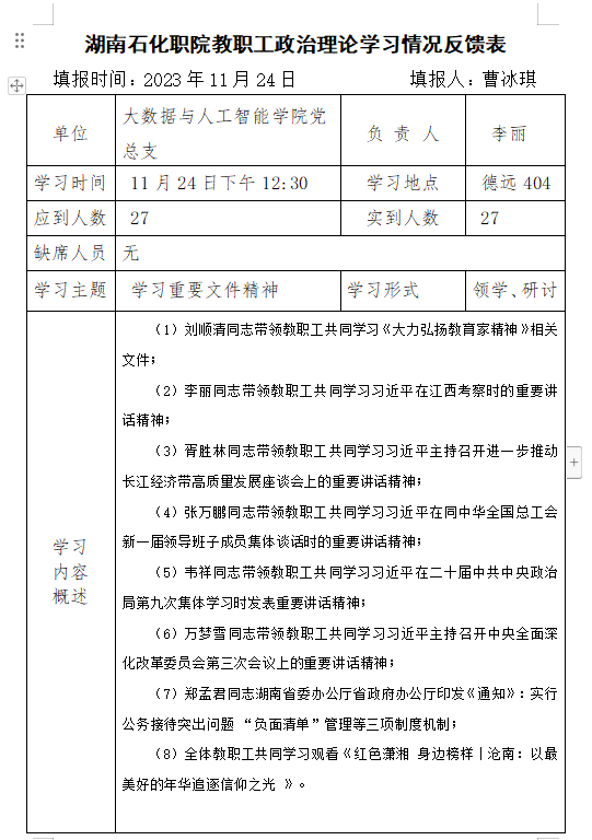 2023年11月中心组、教职工政治理论学习情况