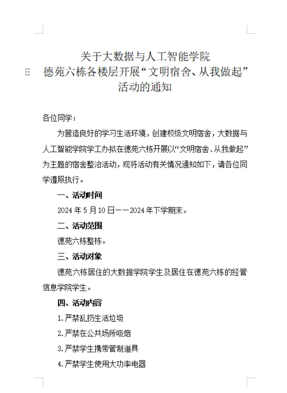 为营造良好的学习生活环境,创建校级文明宿舍,大数据与人工智能学院学工办拟在德苑六栋开展以“文明宿舍、从我做起”为主题的宿舍整治活动。
