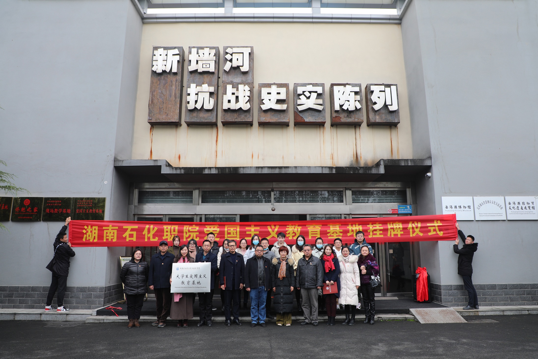 12月10日,我院爱国主义教育基地挂牌仪式暨“继承先烈志、共筑中华魂”主题教育活动在新墙河抗战史实陈列馆举行。学院党委书记雷放华,党委副书记徐方,党委委员、宣传部长王智,新墙河抗战史实陈列馆馆长杨坚和我院部分中层领导干部、辅导员代表参加仪式。雷放华、徐方为大学生爱国主义教育基地揭牌,王智主持挂牌仪式。