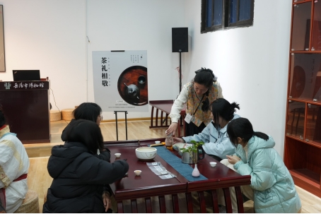 在古色古香的茶室,茶艺师身着典雅茶服,手捧茶具娓娓道来:“茶,发乎神农,闻于鲁周公,兴在唐宋,承载了华夏数千年文明……”她详述了茶路变迁与文化发展,带领师生们仿若穿越时光,见证了茶从药用、祭祀品到全民饮品的变化。在了解了茶文化的基本知识后,学生们开始动手实践,温杯、投茶、注水、出汤,每一步都充满了仪式感。在泡茶的过程中,不仅学会了如何泡出一壶好茶,更体会到了茶文化中的礼仪之美。