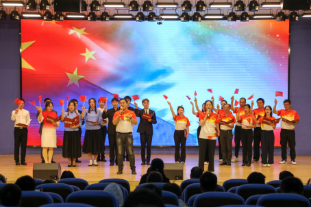 活动现场,诵读会的主办方人文学院的党员教师们还与同学们一起朗诵了诗歌《我骄傲,我是中国人》。朗诵毕,师生们共同挥动着手中的红旗,高声合唱《我和我的祖国》,用歌声抒发对党的真挚情感,表达对祖国的真情热爱和深深祝福。