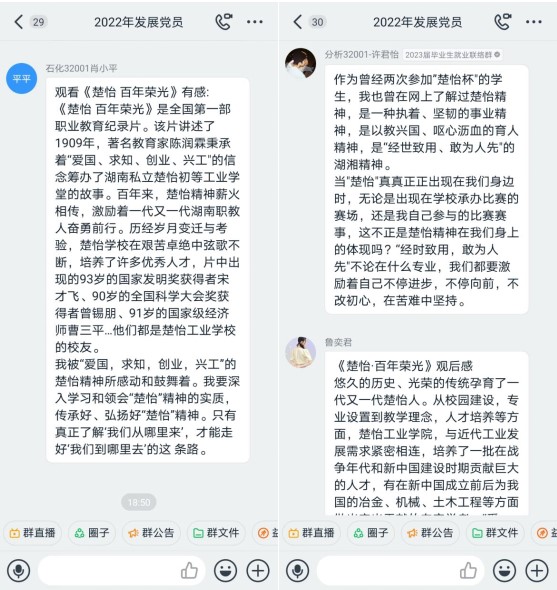 “爱国、求知、创业、兴工”八字“楚怡”精神震撼了所有人的心,党员教师们纷纷感叹职业教育责任重大、前景广阔且大有可为。线上观影的学生们亦备受鼓舞,纷纷表示自己要勇敢担起新时代职教学子的使命和责任,刻苦钻研理论知识,努力锤炼过人技艺,为早日实现中国梦奉献自己的力量。