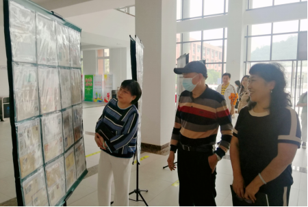 ▲学校副校长郭丽荣(右一)、符文文(左一)到场观展