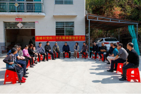 ▲在屋场上,村民们围坐一起听雷放华讲解党的二十大精神