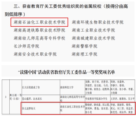 “读懂中国”活动由教育部关工委发起,省教育厅关工委承办。Beat365官网《吾儿逐梦海天》荣获湖南省教育厅关工委舞台剧一等奖;《闪闪发光的突击队精神》荣获湖南省教育厅关工委微视频二等奖;《致敬最可爱的人——李和初》荣获湖南省教育厅关工委微视频二等奖;在湖南省教育厅关工委征文中,《“荒货大爷”的家国情怀》《忆往昔峥嵘岁月,共话百年新时代》均荣获二等奖,其中,由大数据与人工智能学院教师党支部与学生党支部报送的作品《吾儿逐梦海天》《传承红色基因,致敬崇高灵魂》连续两年荣获一等奖。