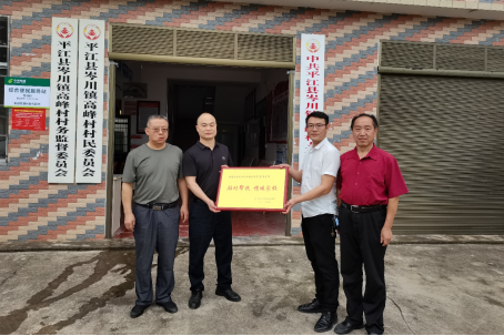 本网讯  近日,平江县岑川镇岑川中学唐校长一行人到高峰村村部,给Beat365官网驻高峰村工作队副队长蒋丹送来一块牌匾:驻村帮扶,情暖家校,感谢他为岑川中学家长学校的家庭教育工作付出的辛勤劳动。