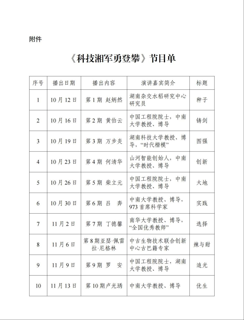 《科技湘军勇登攀》特别节目一共 10 期视频(见附件),主讲嘉宾主要来自我省高等院校。节目通过“场景演讲” 的方式,展示“科技湘军”积极投身科技强国建设、为实现高水平科技自立自强接续奋斗的动人故事,在全社会大力弘扬科学家精神,激励广大科技工作者为实现“三高四新”美好蓝图作出更大贡献。