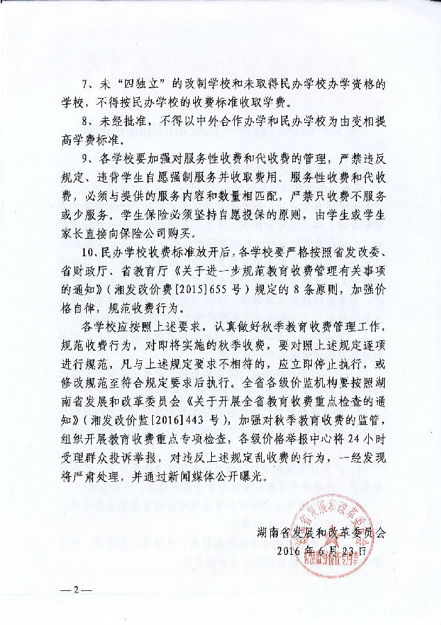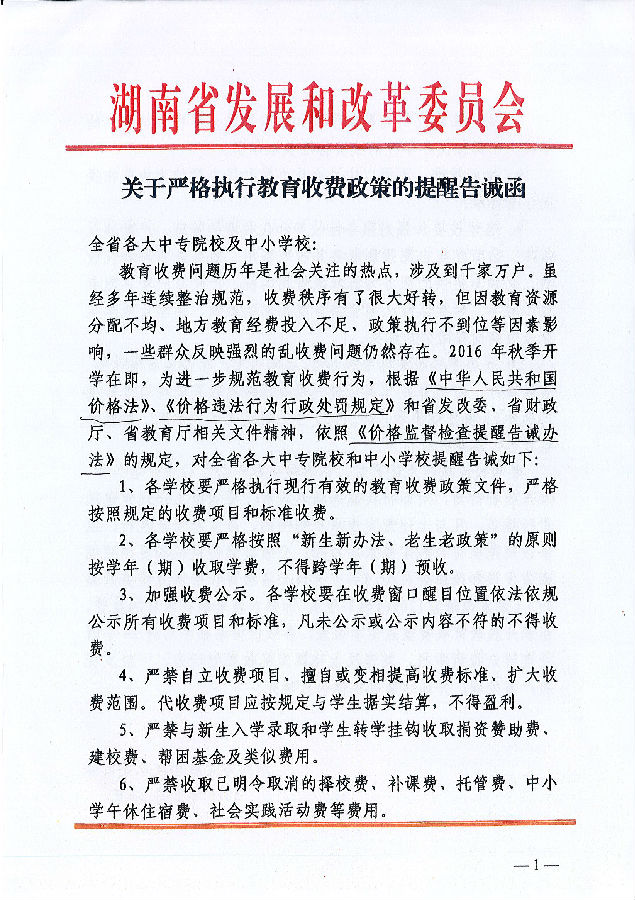 湖南省发展和改革委员会《关于严格执行教育收费政策的提醒告诫函》