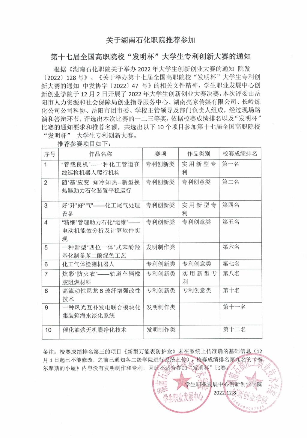 关于湖南石化职院推荐参加第十七届全国高职院校“发明杯”大学生专利创新大赛的通知