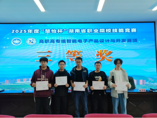 由湖南工业职业技术学院承办的“智能电子产品设计与开发”赛项中,全省66支院校队伍同场竞技。我院电气自动化技术专业的刘衍海、邹胡军、肖密、黄家灿四名同学,在余功成、刘应两位老师的指导下,荣获团体三等奖。在岳阳职业技术学院承办的“CAD机械设计”赛项里,面对全省80支参赛队伍的激烈竞争,增材制造技术专业的杜磊、方宇杰同学,在王渴、张艳芝老师的悉心指导下,均取得个人赛二等奖的优异成绩。