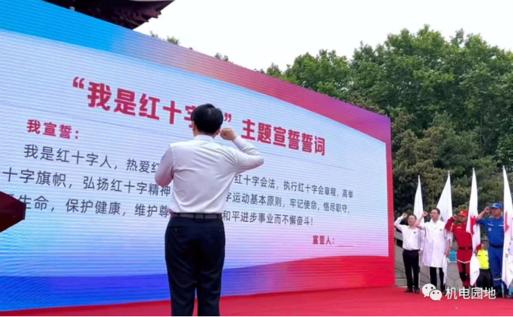 副市长、市红十字会会长黄伟雄带领大家一起庄严宣誓:“我是红十字人,热爱红十字事业,遵守红十字会法,执行红十字会章程,高举红十字旗帜,弘扬红十字精神,践行红十字运动基本原则,牢记使命,恪尽职守,关爱生命,保护健康,维护尊严,为促进和平进步事业而不懈奋斗!”的“我是红十字人”主题宣誓誓