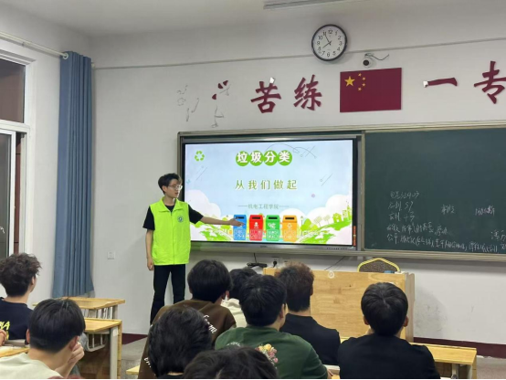 校园清洁,文明从我做起:在图书馆、实训室、食堂周边,志愿者们发起“弯腰行动”,清理垃圾30袋,清空教室广告垃圾。团总支牵头成立“垃圾分类宣讲团”,走进16个班级普及分类知识,覆盖800余名学生。
