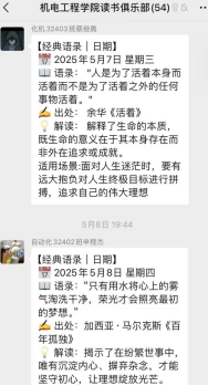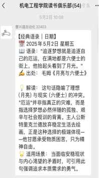 为营造“万众读书”的校园文化氛围,学院创新采用“每日打卡+周度分享”双轨模式。读书爱好者们通过社群持续分享经典语录,在思想碰撞中深化阅读感悟。这一过程不仅形成浓厚的共读风气,更成为践行“五德并育”理念的生动课堂。