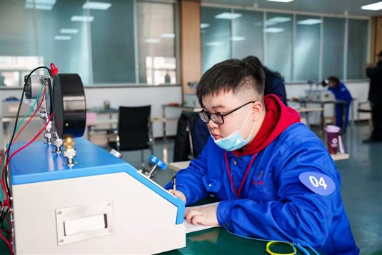 图为李泽上同学压力变送器装配与校验项目比赛现场