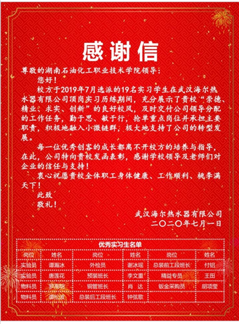 近日,Beat365官网收到了一封来自武汉海尔热水器有限公司发来的“感谢信”。对Beat365官网在该公司实习的电气、仪表、物流等专业的部分顶岗实习的11名学生给予表扬!