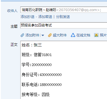 ①先进行预报名,3月14日12:00—17日12:00期间,发送姓名、班级、学号、身份证号、联系电话、报考等级至邮箱(2070356407@qq.com),邮件主题填写:预报名参加四(六)级考试。(邮件样板见附件)。 ②进行正式报名。在邮箱进行了预报名的考生,3月19日12:00-3月24日12:00,登录网站:http://cet-bm.neea.edu.cn/进行正式报名,完成用户注册、查证报名资格、个人信息确认、选择报考科目、网上缴费等报名手续。 特别注意:只有进行了预报名的考生可以参与正式报名。 |