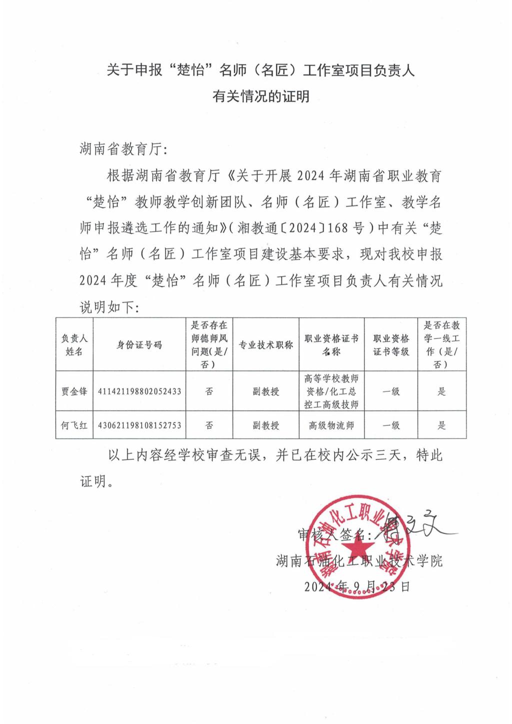 关于申报“楚怡”名师(名匠)工作室项目负责人有关情况的证明