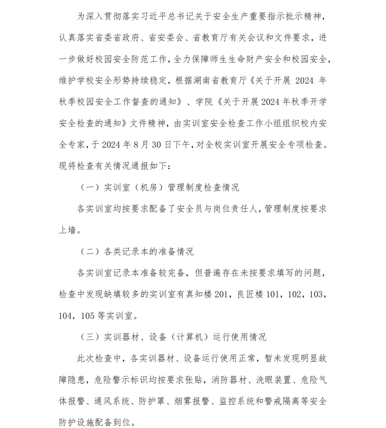 2024年秋季开学实训室安全管理工作专项检查情况通报