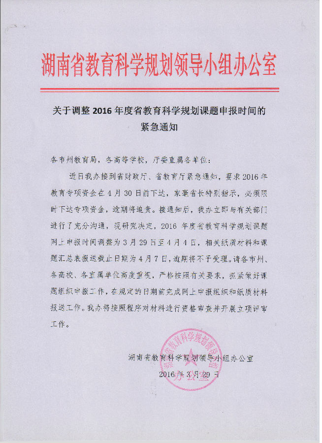 关于调整2016年度省教育科学规划课题申报时间的紧急通知