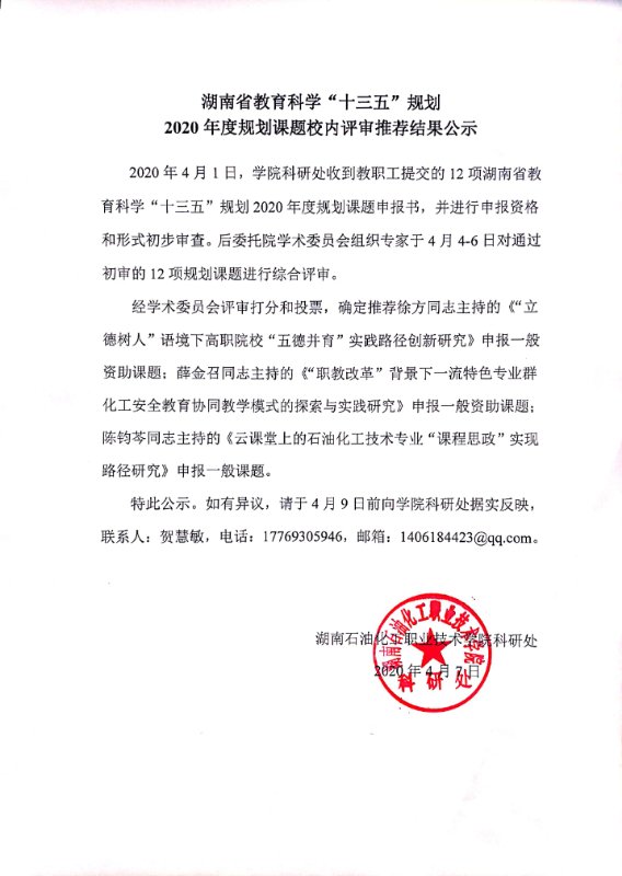 湖南省教育科学“十三五”规划2020年度规划课题校内评审推荐结果公示