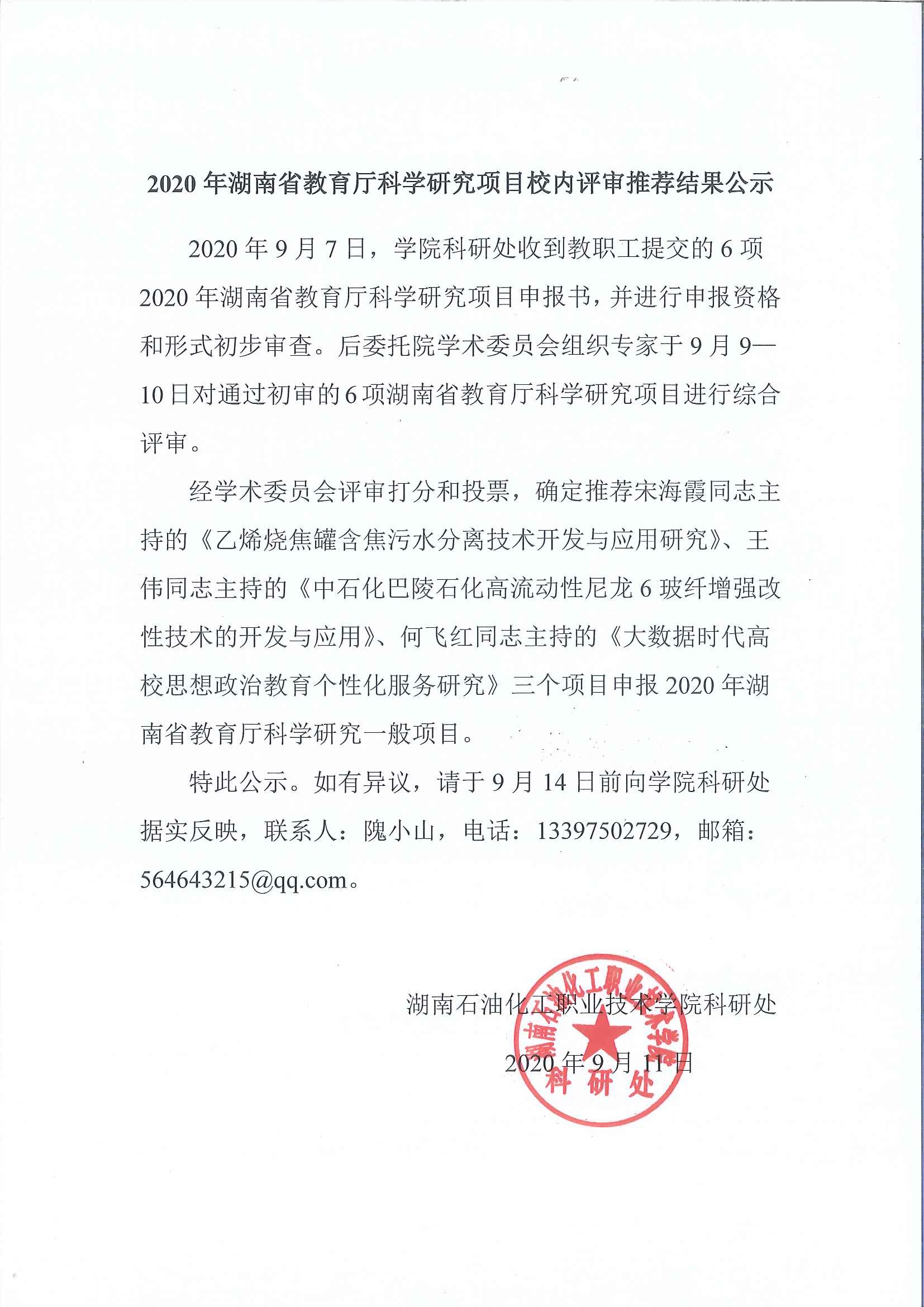 2020年湖南省教育厅科研项目校内评审推荐结果公示