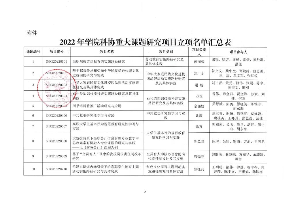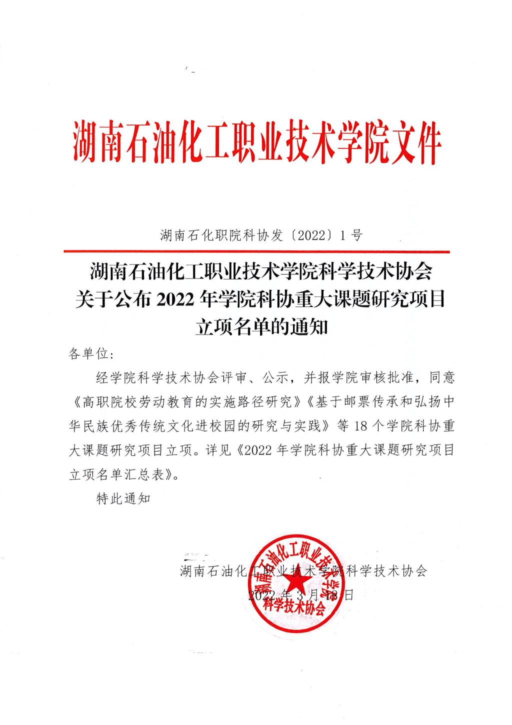 关于公布2022年学院科协重大课题研究项目立项名单的通知