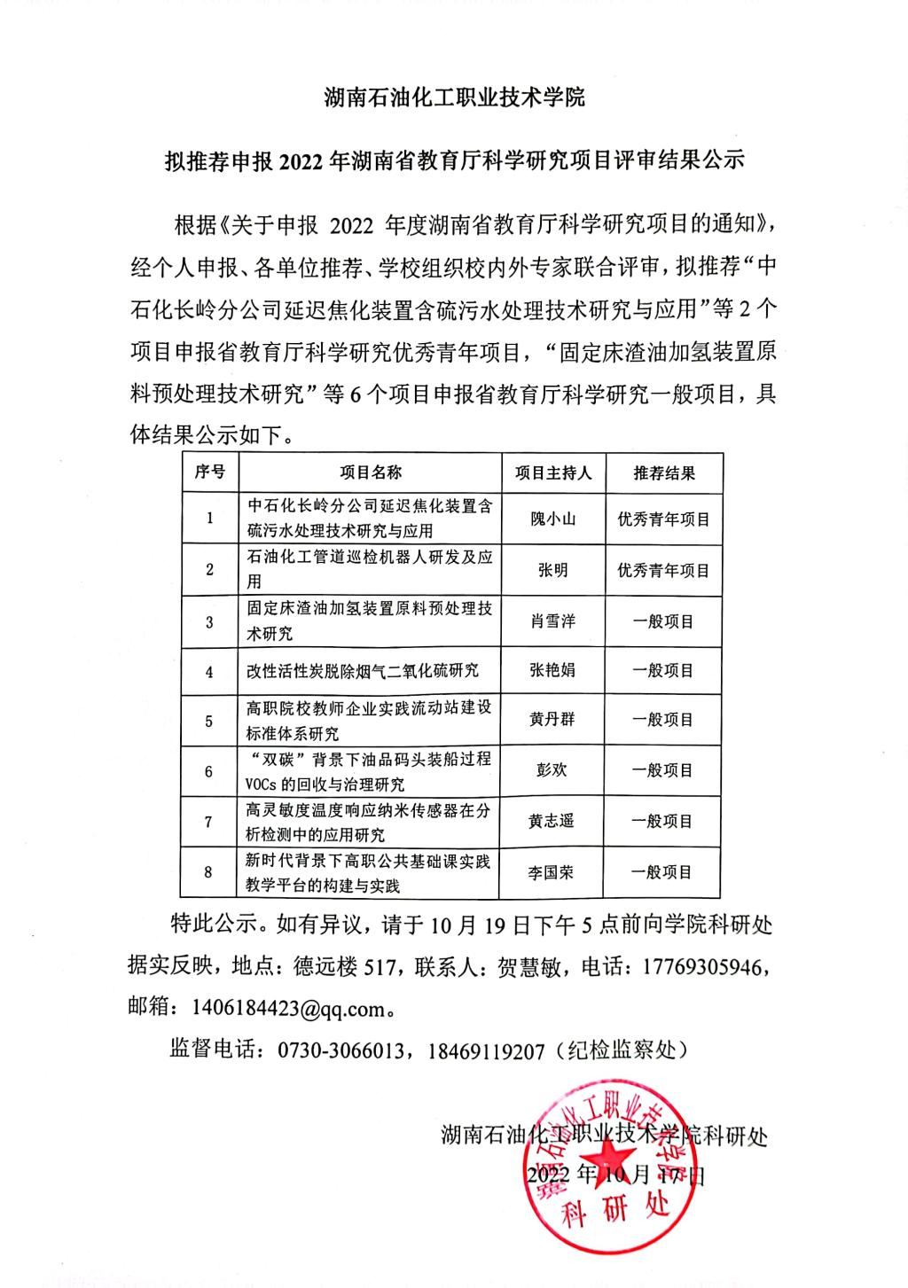 湖南石油化工职业技术学 拟推荐申报2022年湖南省教育厅科学研究项目评审结果公示