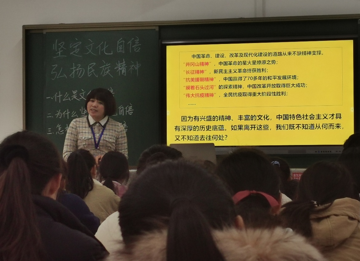 首先,示范课观摩。岳阳职院思政课部教师和我院思政教师共同听取了胡迪老师《坚定文化自信 弘扬民族精神》。胡老师在课堂中,以“什么是文化自信”“为什么要坚定文化自信”“怎样坚定文化自信”为主讲内容,为师生呈现了一场思想深邃、生动有趣、通俗易懂的“新时代爱国主义教育”大课。