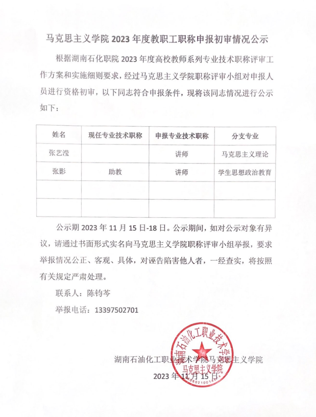 马克思主义学院2023年度教职工职称申报初审情况公示