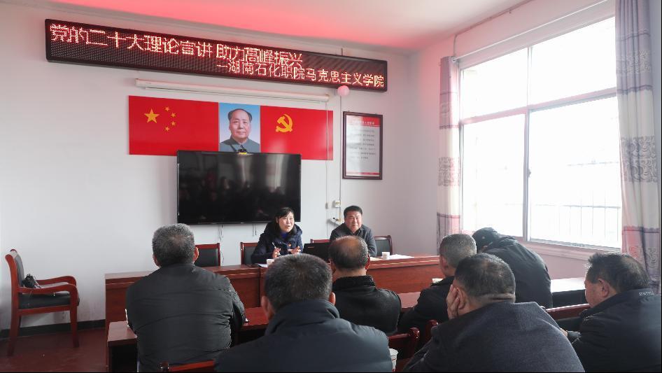 在当地讲习所,马克思主义学院院长姚霞以《励志复兴伟业,踔厉奋发前行》为题,副院长谢畅以《聚焦中国式现代化,助力乡村振兴》为题,为高峰村的党员和村民们做了党的二十大精神宣讲。运用通俗易懂的“百姓话”,让大家听得懂、听得进、用得上,面对面地将党的二十大精神传达给更多的村民。