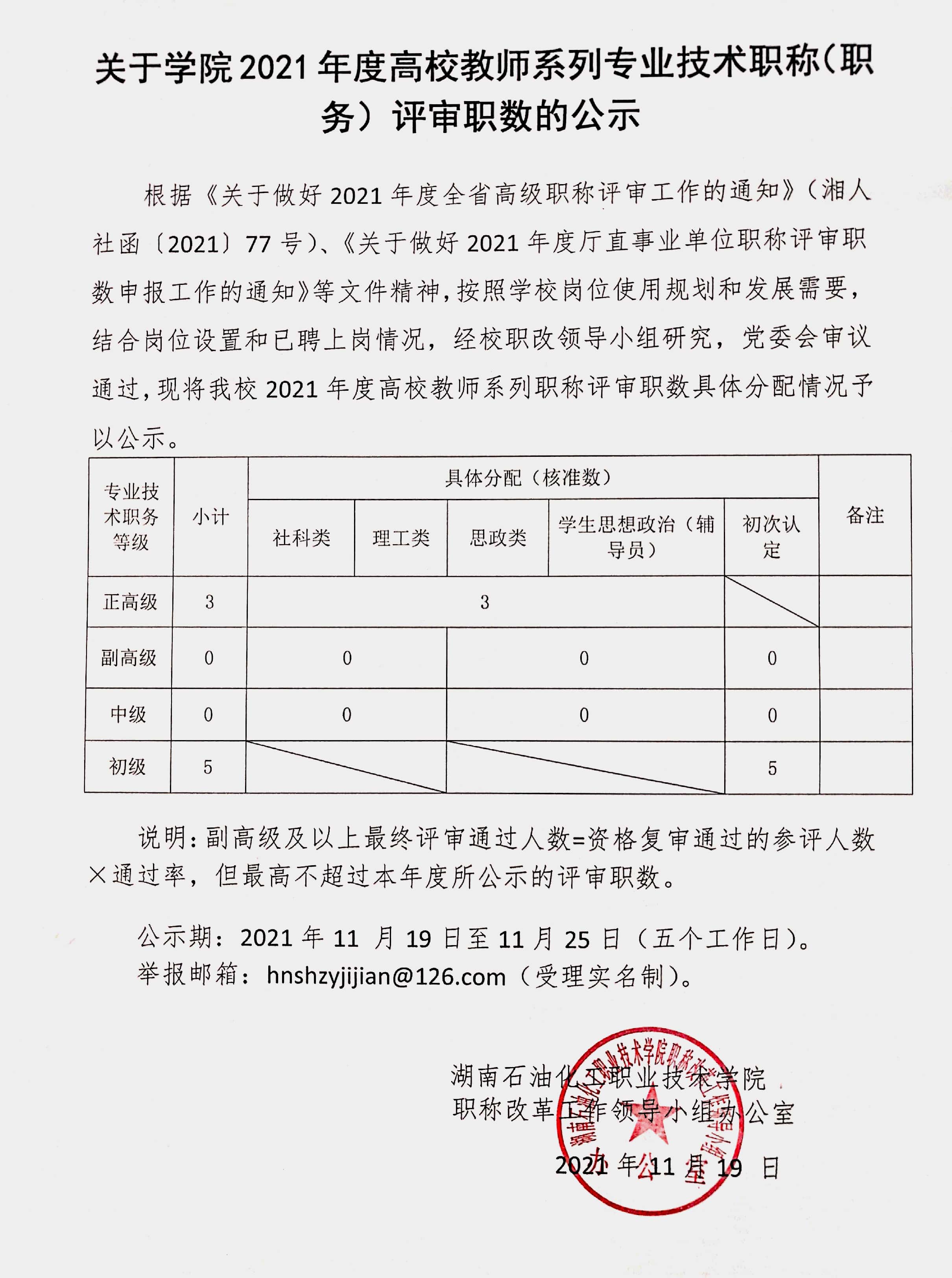 关于学院2020年度高校教师系列专业技术职称(职务)评审职数的公示