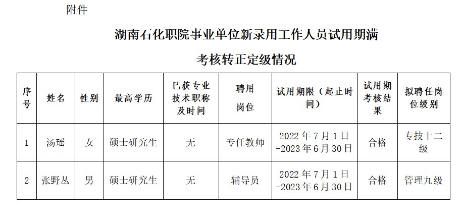 附件:湖南石化职院事业单位新录用工作人员考核转正定级情况