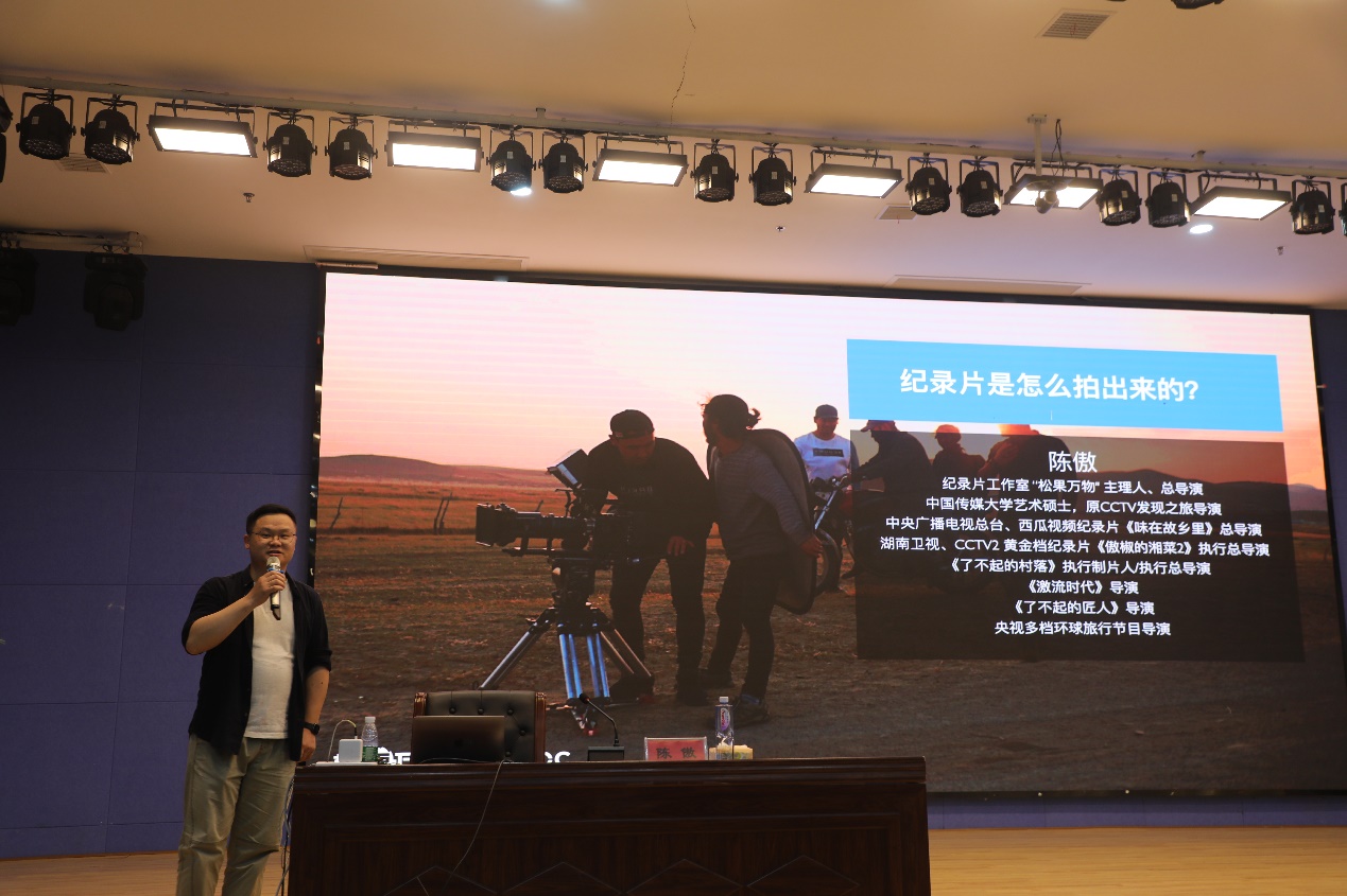 陈傲是纪录片工作室“松果万物”的主理人、总导演,原CCTV发现之旅导游,代表作《了不起的村落》《了不起的匠人》《傲椒的湘菜》等。讲座伊始,陈傲导演向大家展示了其作品《了不起的村落》中的一集,通过讲述拍摄过程中的亲身经历,带领同学们走近爆款纪录片的幕后故事。