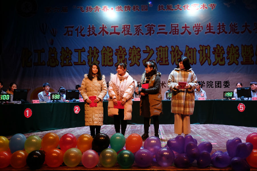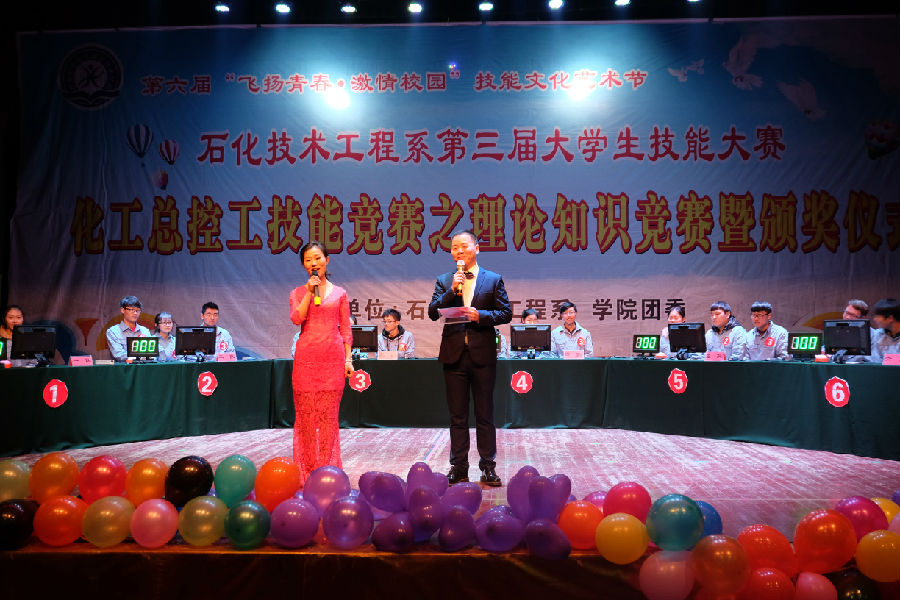 化工总控工赛项中,经过理论知识、仿真操作和现场实操3个项目的初赛、复赛的激烈角逐,最终6支参赛队伍脱颖而出,获得决赛资格,并于12月14日晚上7点,在学院大礼堂参加石化技术工程系第三届大学生技能大赛化工总控工理论决赛暨颁奖仪式,学院副院长符文文,石化系主任肖宜春,副主任邓有贵、陈卓,部分专任老师、辅导员和全系700多名学生一同参加。