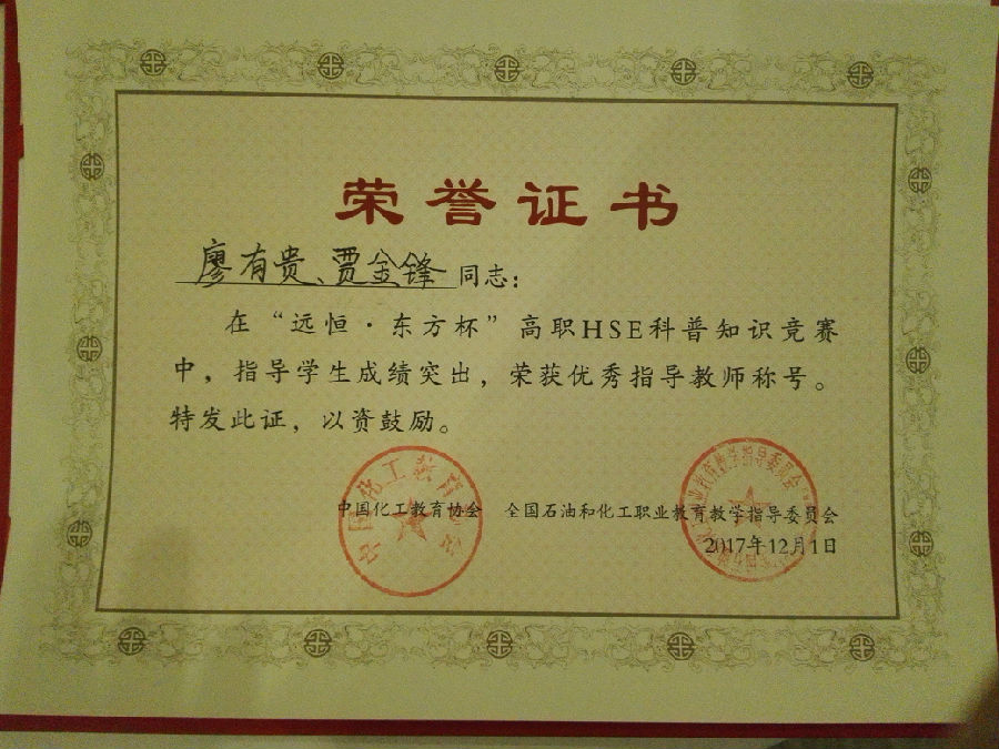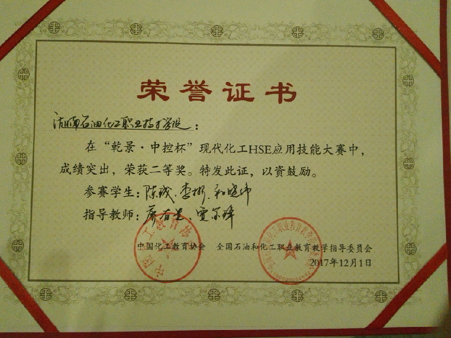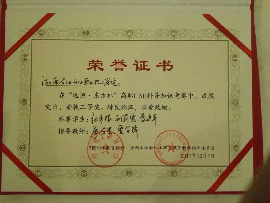 我院参赛队由石化技术工程系张争银(石化3163班)、刘莉霞(石化3162班)、李建军(石化3162班)三名学生组成的“科普队”和陈钱(石化3161班)、李彬(石化3164班)、和晓伟(炼油3161班)三名学生组成的“技能队”组成。在廖有贵、贾金锋两位老师的精心指导下,经过赛前的充分准备和反复高强度的训练,经过两天激烈的角逐,我院代表队不负众望,荣获高职现代化工HSE科普知识竞赛团体二等奖和高职现代化工HSE应用技能竞赛团体二等奖;廖有贵、贾金锋两位老师分别荣获“优秀指导教师”荣誉称号。