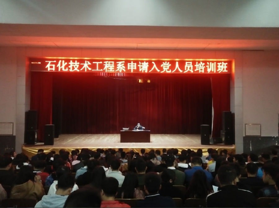 017年11月12日下午3点“石化技术工程系申请入党人员培训班”在大礼堂举行,200多名申请入党的同学认真聆听了刘顺清书记的精彩讲座,大礼堂内掌声阵阵。