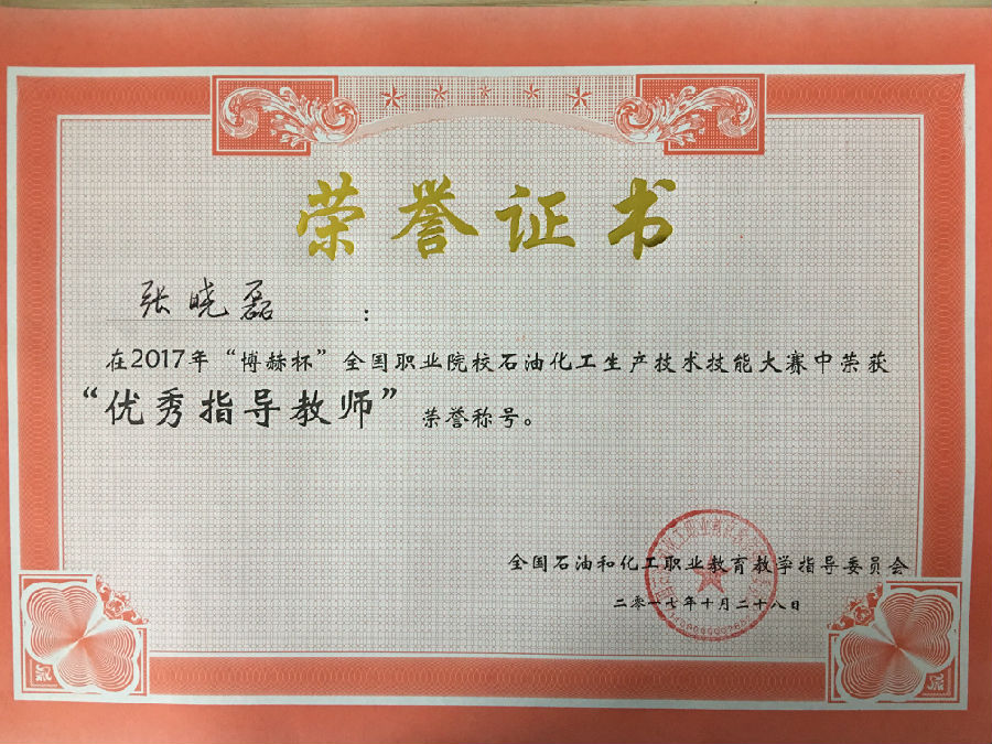作为我省唯一代表队,我院派出了由三位学生包正文(应化31501班)、王凯(石化3163班)、王义臣(石化3161班)和两位指导教师(赵克、张晓磊)组成的代表队参加了本次比赛,经过三天的激烈比赛,我院代表队最终以总分第二名的成绩荣获2017年“博赫杯”全国职业院校石油化工生产技术技能大赛团体一等奖, 赵克、张晓磊两位老师荣获“优秀指导教师”荣誉称号。