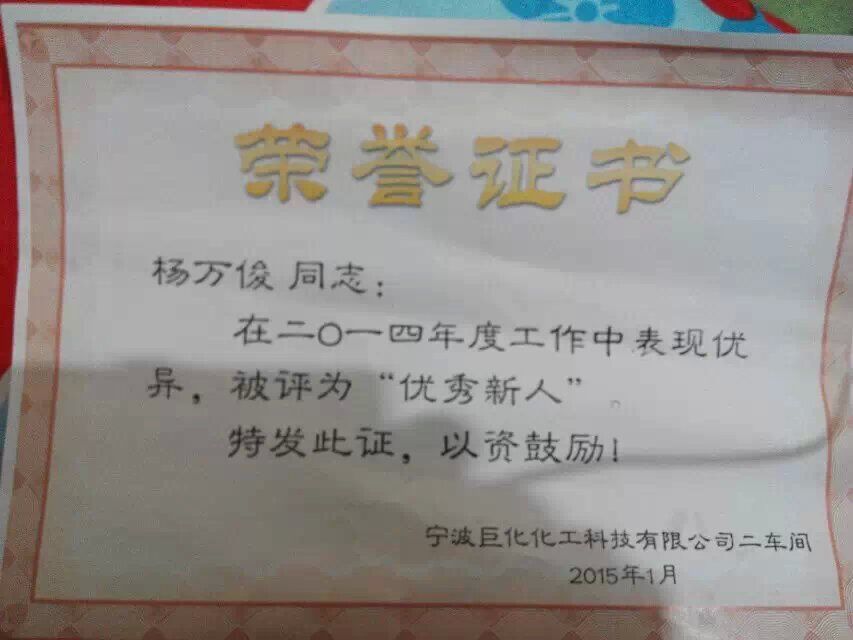 祝贺石化3125班杨万俊同学被评为“优秀新人”——宁波巨化
