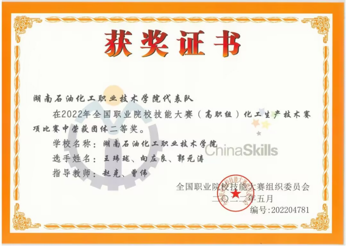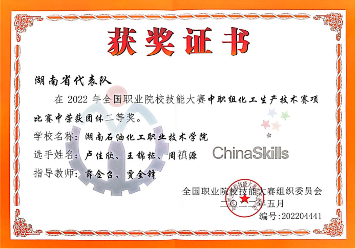 近日,2022年全国职业院校技能大赛赛事活动陆续在全国各大高职院校落下帷幕。在本次国赛上,石化工程学院共有三个赛项代表湖南省参赛并全部获奖,其中“高职组化工生产技术”和“中职组化工生产技术”两个赛项荣获团体二等奖,“高职组化学实验技术”赛项荣获个人三等奖,实现了国赛获奖数量和质量双突破。