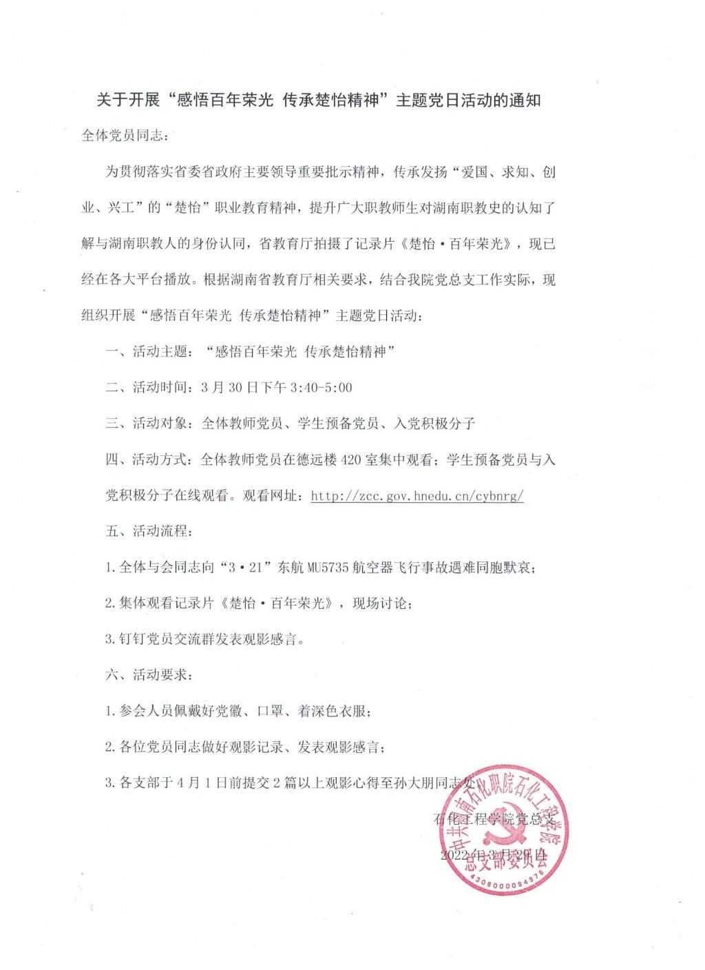 关于开展“感悟百年荣光 传承楚怡精神”主题党日活动的通知