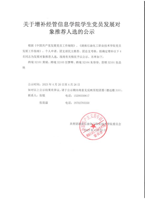 关于增补经管信息学院学生党员发展对象推荐人选的公示