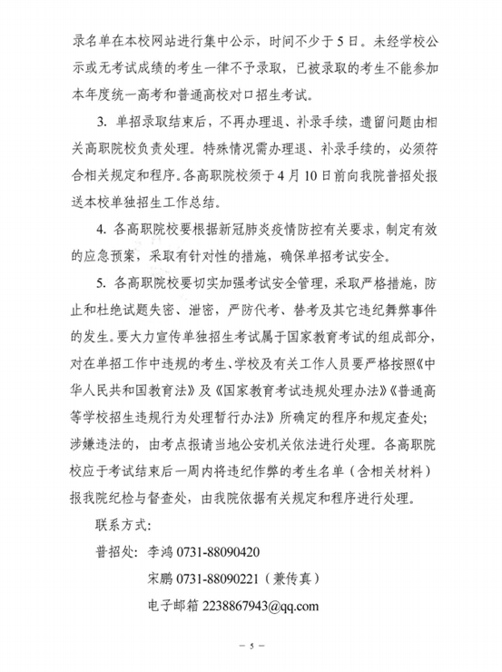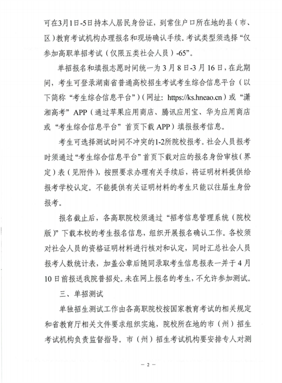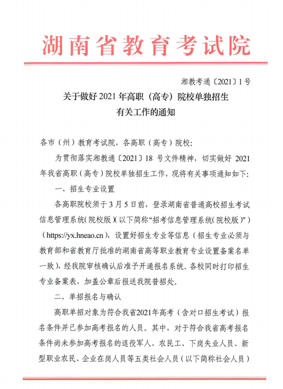 关于做好2020年高职(高专)院校单独招生有关工作的通知 湘教考通〔2020〕4号
