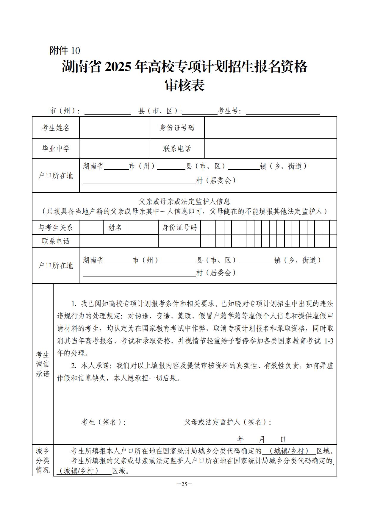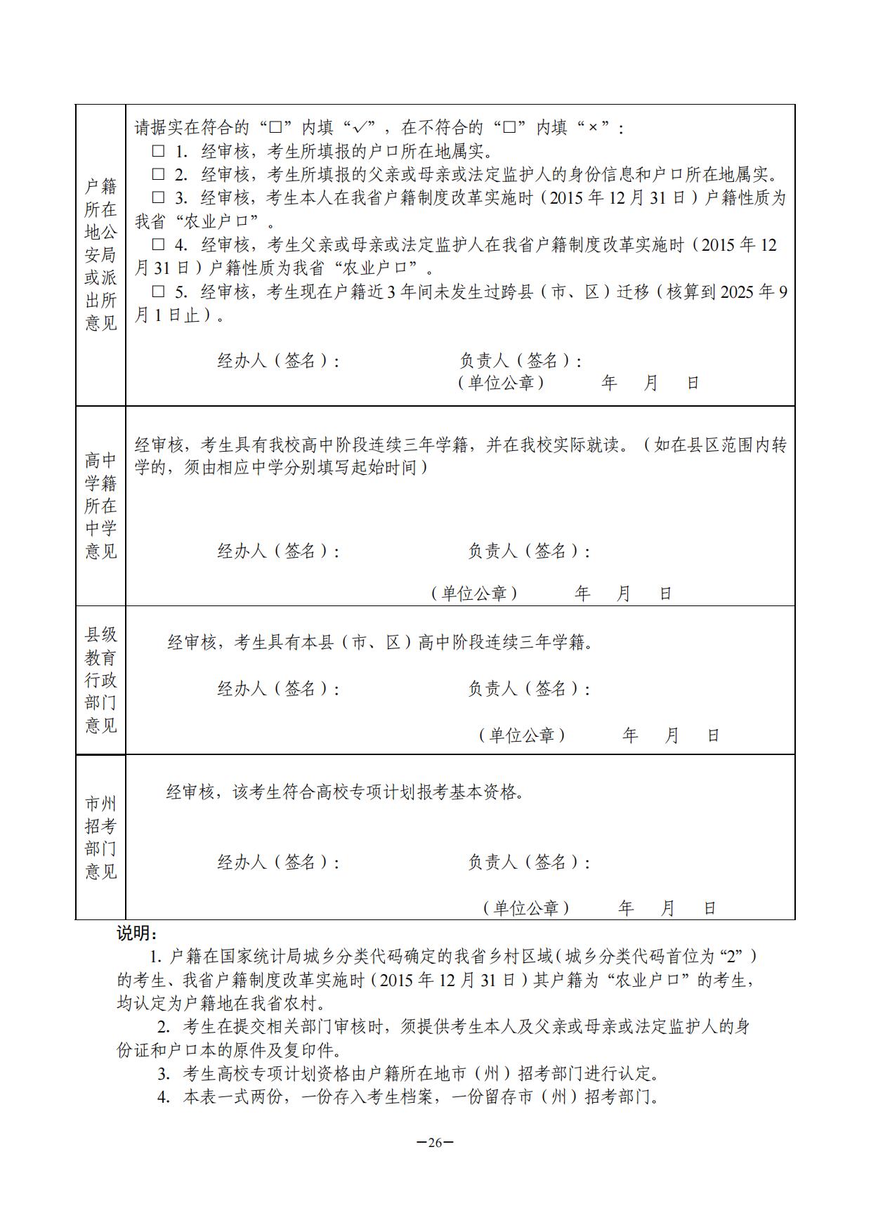 (三)高校专项计划。按照相关规定,我省实施高校专项计划的区域为茶陵县等51 个县(市、区)(见附件14)。报考学生须同时具备以下基本条件:(1)符合我省2025年统一高考报名条件并已参加当年高考报名;(2)考生本人及其父亲或母亲或法定监护人户籍在我省实施区域且城乡分类代码确定为乡村区域(国家统计局公布的2024年统计用区划代码和城乡划分代码中城乡分类代码首位为“2”),或在我省户籍制度改革实施时(2015年12月31日)户籍为我省实施区域的农业户口,其中考生本人须具有当地连续3年以上户籍;(3)考生本人具有户籍所在县(市、区)高中连续3年学籍并实际就读。在此基础上,有关高校可提出其他报考要求并在招生简章中明确。